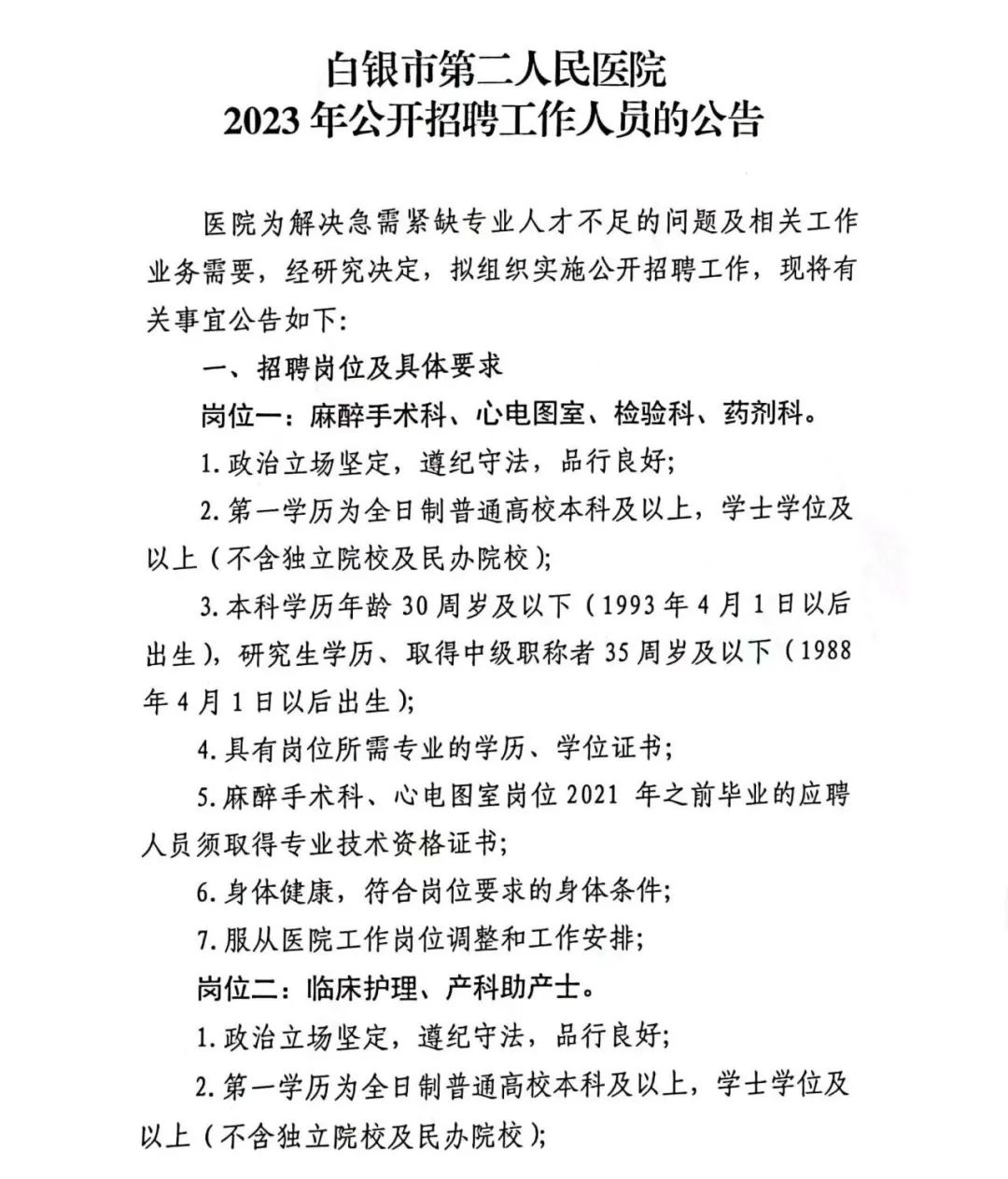 >【“三抓三促”行动进行时】白银市第二人民医院2023年公开招聘工作人员的公告