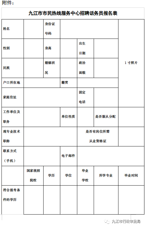 2.报名方式:报名人员请将九江市市民热线服务中心招聘话务员报名表(见附件)发送至12345热线邮箱:12345rs@jiujiang.gov.cn