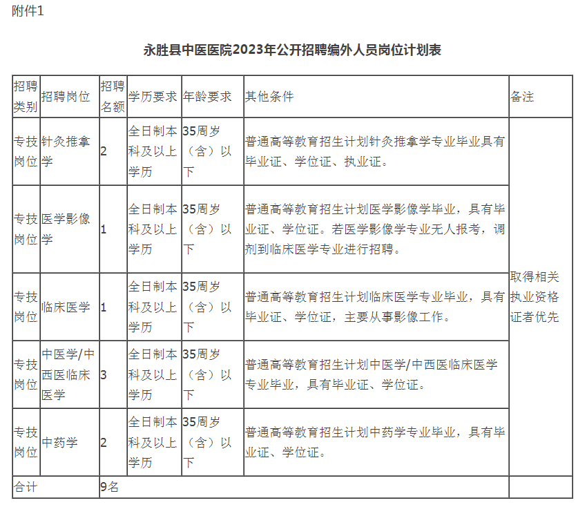 招聘岗位、名额及其他具体条件详见附件1《永胜县中医医院2023年公开招聘编外人员岗位计划表》。