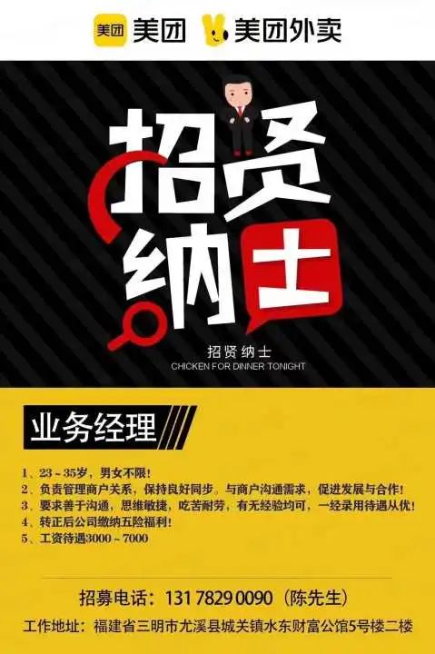 职位描述:尤溪美团外卖招聘3名业务经理:1、23~35岁,男女不限!2、负责管理商户关系,保持良好同步。与商户沟通需求,促进发展与合作!3、要求善于沟通,思维敏捷,吃苦耐劳,有无经验均可,一经录用待遇从优!4、转正后公司缴纳五险福利!5、工资待遇3000~7000 工作地点:福建省三明市尤溪县城关镇水东财富公馆5号楼二楼 联系方式:陈先生,13178290090