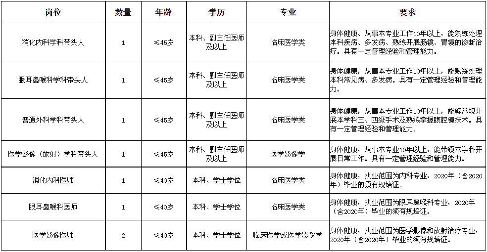 消化内科学科带头人1名、眼耳鼻喉科学科带头人1名、普通外科学科带头人1人、医学影像(放射)学科带头人1名、消化内科医师1名、眼耳鼻喉科医师1名、医学影像医师2名。