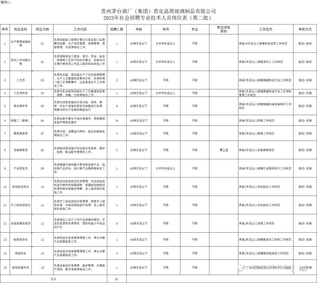 具体招聘岗位及条件见附件1《贵州茅台酒厂(集团)贵定晶琪玻璃制品有限公司2023年社会招聘专业技术人员岗位表(第二批)》。