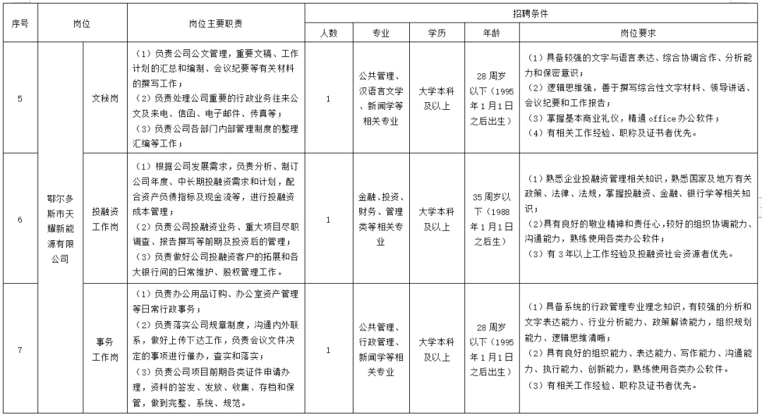 鄂尔多斯市天耀新能源有限公司招聘14人;