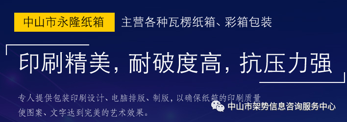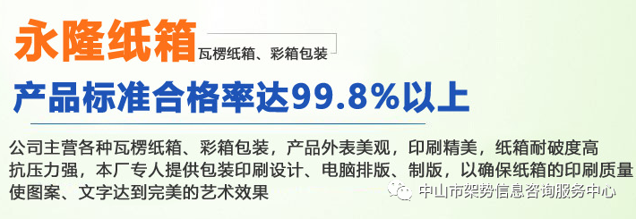 中山市永隆纸箱有限公司是一家集生产加工、经销批发的私营独资企业,年产量达6000万以上,上缴国税达200万以上。公司成立于2005年,座落在中山著名生产基地—小榄,主营各种瓦楞纸箱和各类彩盒包装等一系列产品。