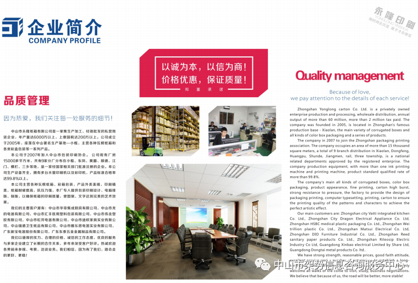 本公司于2007年加入中山市包装印刷协会。公司现有厂房15000多平方米,共有9家分厂分布在小榄、东凤、黄圃、顺德、江门、横栏、三乡等地,是一家经国家相关部门批准注册的企业。本公司生产设备齐全,拥有多台水墨印刷机以及彩印机,产品标准合格率达99.8%以上。