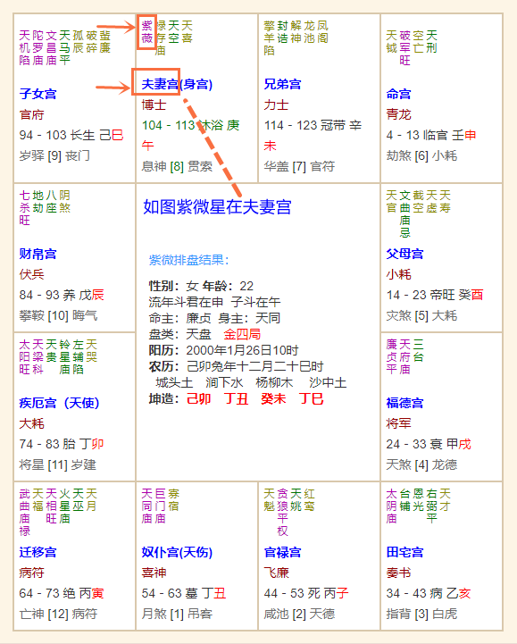 如上图女命夫妻宫有紫微星,并不在下列排行榜。请结合自己的紫微命盘对照文中描述查看即可。
