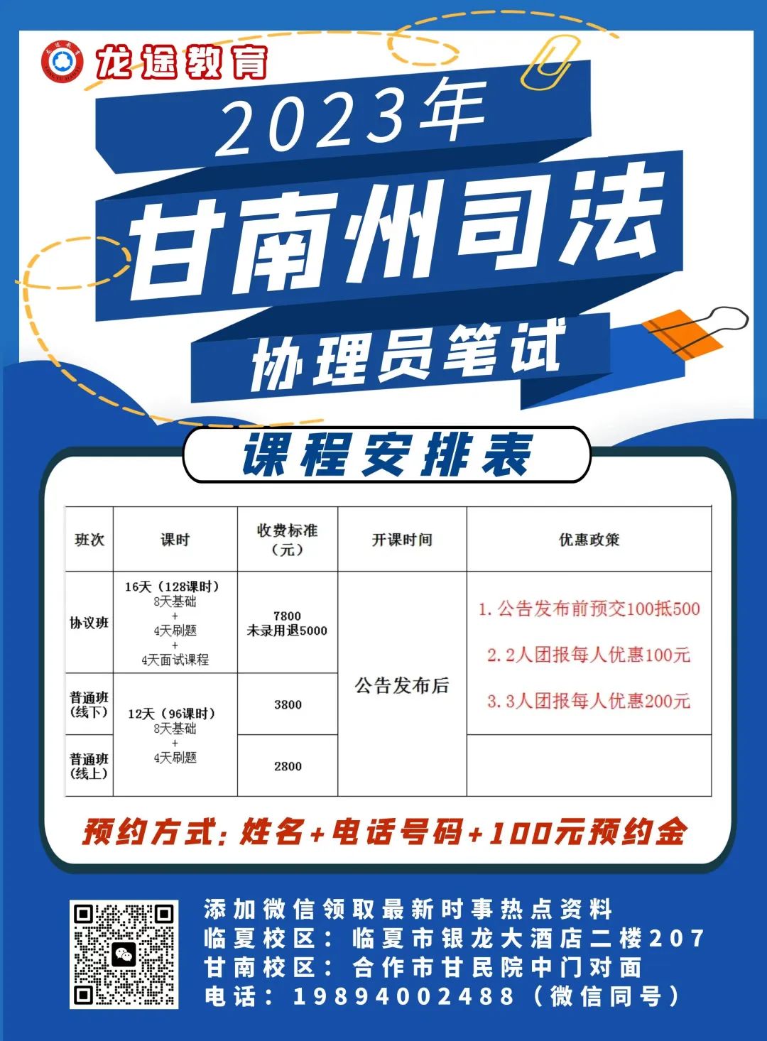 为进一步加强全县基层司法行政工作,有效缓解基层司法所工作人员力量不足的突出问题,根据甘南州人力资源和社会保障局、甘南州司法局、甘南州财政局《关于印发<甘南州公开招聘基层司法所司法协理员>实施方案的通知》(州人社字〔2023〕245)文件要求,经县委、县政府同意,决定面向社会公开招聘基层司法所司法协理员。现就有关事项公告如下: