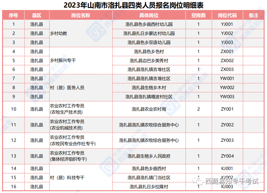 附件1:《洛扎县2023年招聘大学生乡村振兴专干、村(居)科技专干、医务人员、农业农村工作专员和乡村幼教人员报名岗位明细表 》