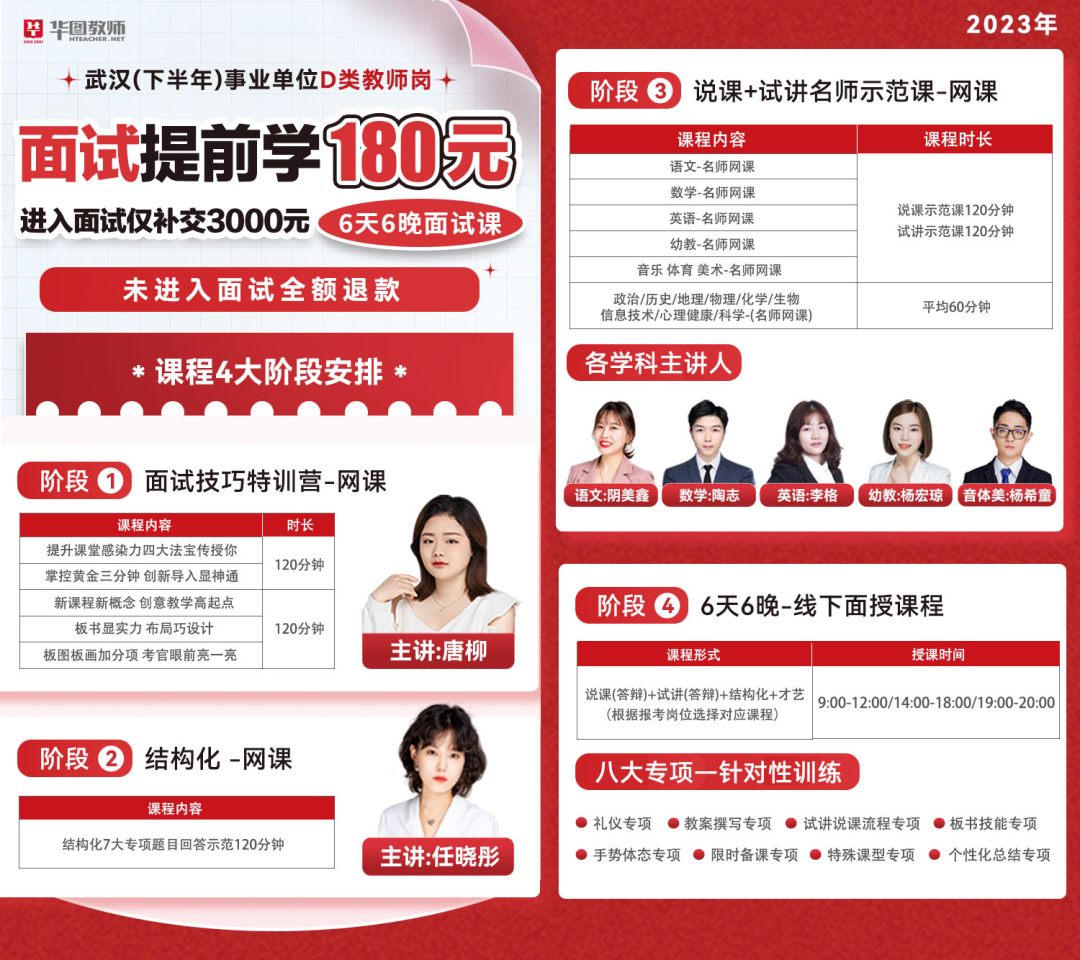 (四)报名期间,招聘政策可咨询武汉市人社局(027-83919149);退役军人身份认定等政策可咨询市退役军人事务局(027-82281320、82281323);岗位所需的学历、专业、教师资格证等相关问题可咨询市教育局(027-65608497)或招聘单位(咨询电话见《武汉市2023年度面向优秀退役军人专项招聘教师岗位一览表》);网上报名操作相关问题可咨询武汉市人事考试院(027-82639495)。