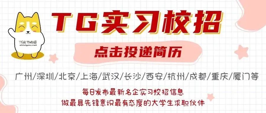公众号:目前已开通TG广州实习校招、TG深圳实习校招、TG北京实习校招、TG上海实习校招、TG武汉实习校招、TG长沙实习校招、TG成都实习校招、TG西安实习校招、TG重庆实习校招、TG厦门实习校招、TG杭州实习校招。