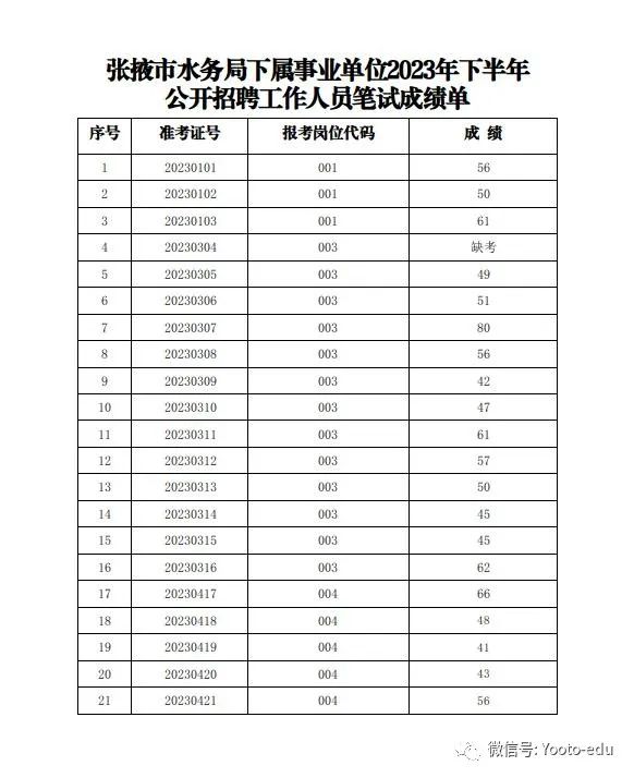 张掖市水务局下属事业单位2023年下半年公开招聘工作人员笔试成绩公示