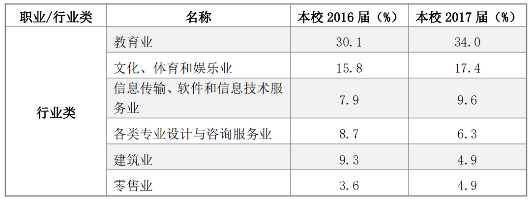 本科毕业生分布在学校的11个二级学院、50个专业(方向)之中。其中人数最多的是艺术与科技专业的277人(创新设计学院),该专业占本科生总人数的16.26%,也是唯一的一个毕业生人数超过100人的专业(方向)。该专业在设计艺术学院还有45人,其中会展设计方向23人、综合设计方向22人。