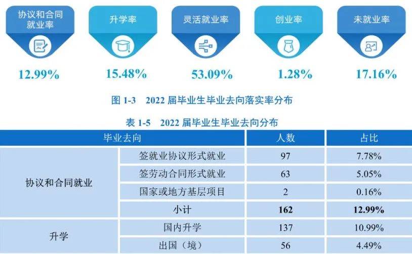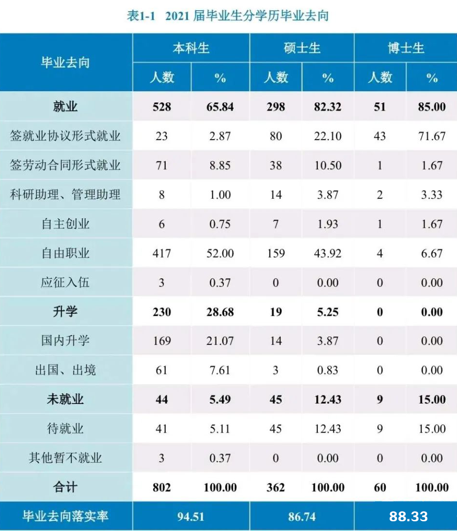 学校公布数据显示,本科毕业生就业率为90.9%、硕士生为97.68%、博士生则是98.72%,学校毕业生整体去向落实率为92.87%左右。其中,升学深造率为20.64%,受雇工作比例为45.44%,灵活就业为6.57%,待就业比例为24.8%。前后两个数据对比,估计有网友会发现两个数据的差异,为何在毕业生职业发展类型中待就业比例达到了24.8%,而毕业生就业落实率却接近93%呢?