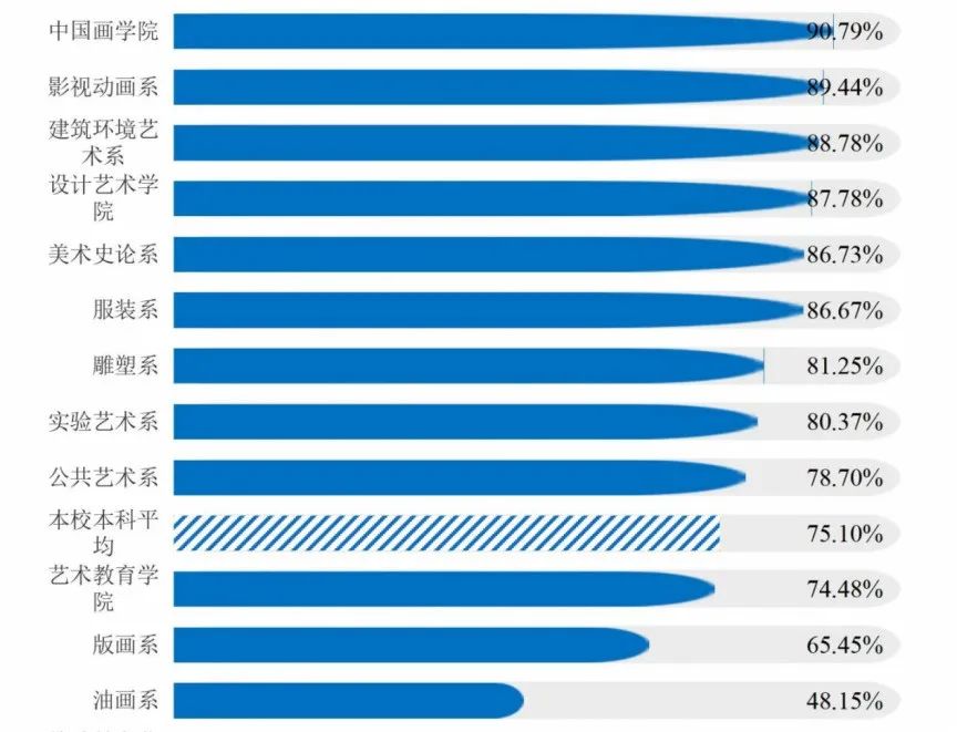 从中国美院公布的数据来看,2022年本科毕业生中有366人选择升学深造,占本科毕业生总人数的21.48%,其中选择出国留学的比例为3.82%左右。毕业生留校深造人数为342人(其中考取本校博士5人)。