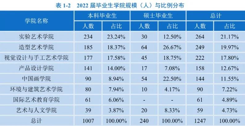 中国美术学院2022年共有毕业生2385人。其中,本科毕业生1704人占比为71.45%,硕士毕业生人数603人占比为25.28%,博士毕业生78人占比为3.27%。所有毕业生中,男生只有626人,女生人数达到1759人,男女比为1:2.8左右,这个比例与目前国内美术类专门高校平均性别比差距大体相当。