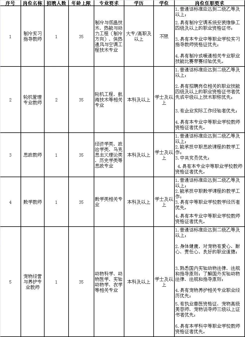 1.制冷实习指导教师、轮机管理专业教师、思政教师、数学教师、宠物养护与经营专业教师等岗位采取笔试、面试和考察的方式。