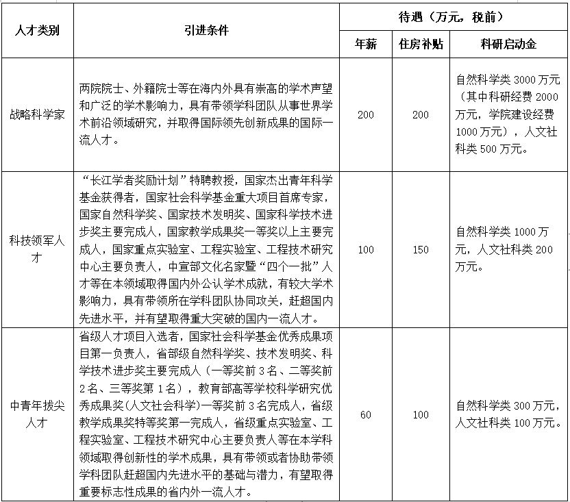 引进的高层次人才分为三个类别,分别是战略科学家、科技领军人才和中青年拔尖人才。具体引进范围如下,待遇不低于以下标准:
