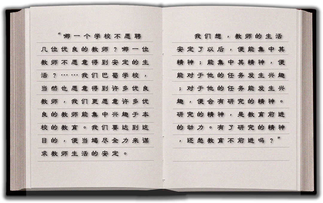教育先贤们高瞻远瞩,一语中的,巴蜀学校关注每一位教师的待遇和成长,其精神之美,思想之光,创新之举,育人之情,已经深深植入到了每一位巴蜀人的血脉。