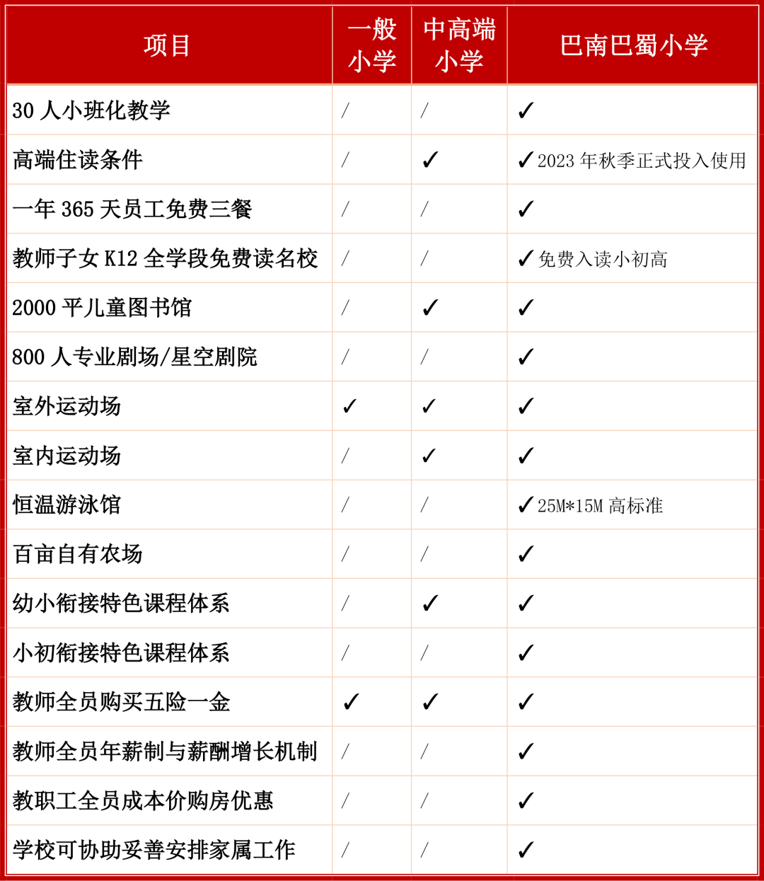 教师子女优先入读重庆巴南行知巴蜀幼儿园,免费入读重庆巴南巴蜀实验小学及重庆巴南育才实验中学初中、高中,省下近百万教育经费,且享受重庆乃至全国一流的教育资源,从此子女教育无后顾之忧。