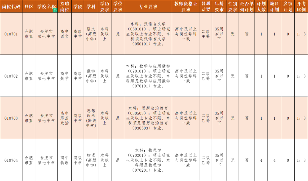根据合肥市教育局、合肥市人力资源和社会保障局联合发布的《2023年度合肥市直属学校新任教师公开招聘公告》,合肥七中此次共招聘语文(1人)、数学(1人)、思想政治(1人)、物理(4人)教师7名,具体岗位要求如下: