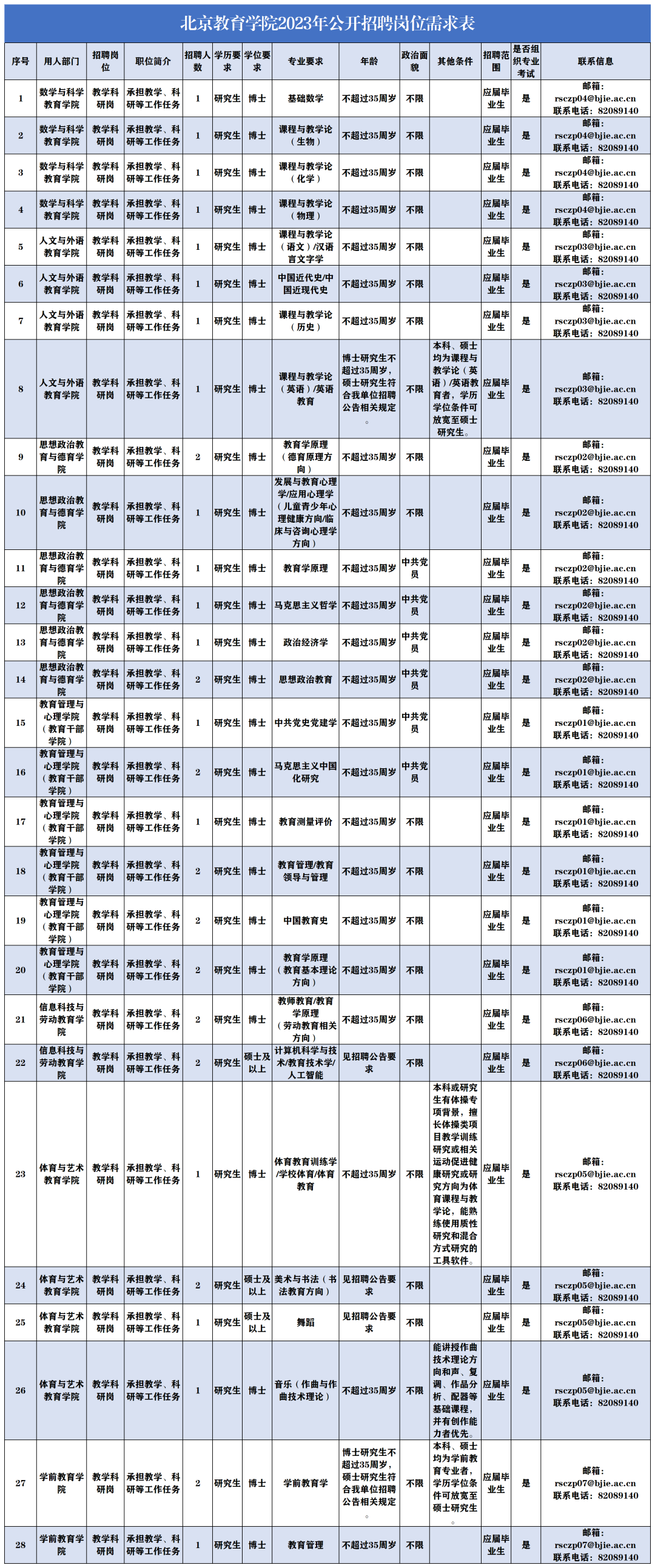 1.拥护中国共产党的领导,坚持社会主义办学方向,贯彻党的教育方针,政治立场坚定,具有正确的世界观、人生观和价值观。2.遵守宪法和法律,品行端正,遵守职业道德,恪守工作纪律,服从学校和所在部门工作安排。3.有志于从事教师教育事业,理论功底扎实、专业素养良好,具备应聘岗位所需的专业知识、工作能力与岗位执行力。5.应届毕业生指列入国家统一招生计划(不含委培生、定向生)的普通高等院校2023届毕业生。(1)在校期间成绩优良,无补考记录,应于2023年6月30日之前取得学历学位证书。(3)硕士毕业生年龄不超过27岁(1996年1月1日之后出生),特别突出者可放宽至30岁(1993年1月1日之后出生);博士毕业生年龄不超过35岁(1988年1月1日之后出生)。6.海外留学回国人员需符合教育部留学服务中心有关海外留学回国人员办理就业报到和落户手续的相关要求。7.博士后流动站研究人员,须符合全国博士后管委会关于进京落户的条件和要求,应于2023年8月31日之前取得博士后证书并完成博士后出站手续。受过行政或刑事处罚、党纪政纪处分的人员;被依法列为失信联合惩戒对象的人员;在各级招聘招考中被认定有舞弊等严重违反录用纪律行为的人员;正在接受纪律审查或涉嫌违法犯罪正在接受调查的人员;具有其他不良行为记录的人员。应聘人员在报名时间内将以下材料发送至指定邮箱。如应聘人员未按规定时间与要求投递简历,学院有权视为报名无效。3.学历学位证书或学籍在读证明等(合并成为一个PDF文档)每人限报1个岗位,邮箱是唯一报名渠道。邮件主题:应聘部门—专业—毕业院校—姓名。应聘资料(压缩包):应聘部门—专业—毕业院校—姓名。更多信息请点击“阅读原文”查看