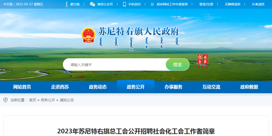 点击下方☟关注"内蒙古好工作" 查看全区更多招聘信息 ![]() 按照盟工会统一安排,进一步充实苏尼特右旗总工会社会化工会工作者队伍,根据《内蒙古自治区总工会社会化工会工作者和专职集体协商指导员聘用管理办法》(内工发〔2019〕26号)《关于进一步加强社会化工会工作者队伍建设若干问题的意见》(内工基字〔2020〕1号)文件精神,苏尼特右旗总工会决定面向社会公开招聘社会化工会工作者,有关事宜如下: 一、招录原则 按照德才兼备的标准,坚持“公开招考、自愿报名、公平竞争、择优录用”的原则,通过考试方式择优招录社会化工会工作者。 1、《2023年苏尼特右旗总工会公开招录社会化工会工作者岗位表》 二、招录岗位计划 全旗招聘社会化工会工作者2人。具体岗位条件详见附件。 三、招录对象及条件 (一)报考人员须具备以下条件 1.具有中华人民共和国国籍,拥护中华人民共和国宪法,拥护中国共产党领导和社会主义制度,维护民族团结和祖国统一,思想政治素质好。 2.遵纪守法,具有良好的职业道德,作风正派,无违法违纪记录。 3.热爱工会工作和群众工作,事业心和责任感强,有较强的组织协调能力。 4.身体健康、具有正常履职的身体条件,能适应基层工作。 5.具有苏尼特右旗户籍,详情阅岗位表。 6.年龄为18周岁以上,37周岁以下,即1986年3月20日(含)至2005年3月20日(含)期间出生的。 7.应往届普通高校全日制大学专科及以上毕业生。 8.具备岗位要求的其他条件。 (二)下列人员不得报考 1.现役军人。 2.试用期内和服务期未满的公务员和事业单位工作人员。 3.在读全日制专科生、本科生、研究生(2023年及以后的毕业生)。 4.曾因犯罪受过刑事处罚或曾被开除公职的人员。 5.在公务员招考或事业单位公开招聘中被认定有舞弊等严重违反录用、聘用纪律行为并在禁考期限内的人员。 6.报考人员不得应聘聘用后即构成回避关系的岗位。 7.法律法规规定其他不宜录用的人员。 四、招录程序 (一)报名 1.报名采取网上报名方式进行。报名和考试不收取任何费用。报名网址:苏尼特右旗人民政府门户网站(www.sntyq.gov.cn),开始报名时通过苏尼特右旗人民政府门户网站通知公告栏目报名入口进入。 报名时间:2023年3月20日8:30至3月24日17:30, 资格初审时间:2023年3月20日8:30至3月25日17:30(3月24日17:30至3日25日17:30,期间不能新增报名,未审核通过人员可修改信息。)请报名人员尽早报名,以便留足修改、补充完善相关信息的时间。 2.报考人员在网上填写《报名登记表》相关信息,并上传本人近期正面免冠数码彩照(jpg格式、大小为20KB以下)。在填写个人简历时,报考人员须完整填写本人就读大学专科及以上学习经历(填写就读起止年月,所读学校、院系、专业);须完整填写工作经历(填写工作起止年月,工作单位,所从事的主要工作)。对不按要求填写的,将不予审核通过。全日制专科、本科、研究生在校就读期间参与的社会实践经历,不视为工作经历。 3.报考人员须用身份证报名,且报名与参加笔试所使用的证件必须一致。 4.报考人员的报名序号是确认是否成功报名、打印准考证和查询成绩的重要依据,请报考人员务必牢记。 5.报考人员要认真阅读招聘简章和岗位招聘条件,报考人员须对报名信息的真实性、准确性和完整性负责,对填报虚假信息或隐瞒重要信息情节严重的,将取消其考试或聘用资格,并记入本人诚信档案。 特别提醒:姓名和身份证号提交后将无法修改,其他信息在资格审查通过后也将无法修改。因考生个人原因导致填报信息错误,如在填写所学专业一栏时未按照毕业证完整正确填写,导致资格复审未通过的,责任由考生自负。 (二)资格初审 1.资格初审工作由苏尼特右旗总工会负责,在网上进行。对符合报名条件的,不得拒绝报名;对审核未通过人员,应及时在资格审核栏中简要说明理由。对未完整填写个人资料或未上传照片导致无法资格初审的人员,视为自动放弃。 2.本次考试设开考比例,报名人数与聘用人员比例达到3:1以上方可开考。 3.报考人员在网上成功提交报名信息后及时登录报名网站查询自己的资格初审情况。初审通过的,即确认完成报名。 4.打印笔试准考证。报考人员于2023年4月6日8:30至4月8日17:30,登录报名网站自行打印笔试准考证。 (三)笔试 1.笔试时间、地点:2023年4月9日9:00—11:30,笔试考点设在苏尼特右旗赛汉塔拉镇,考场地址详见准考证。报考人员凭有效期内的二代身份证或临时身份证和准考证参加笔试,否则不准参加笔试。 2.笔试科目为《综合能力测试》,满分100分,笔试部分主要考察考生的基础知识和综合能力等内容。考试不指定任何考试复习教材及考试大纲。 3.笔试采用闭卷方式进行,提供国家通用语言文字试卷,使用国家通用语言文字作答。同一试卷用两种或两种以上文字作答的,按零分处理。 4.笔试结束后,报考人员的笔试成绩及时在报名网站上公布。 5.本次招聘笔试后各环节出现缺额的(不限于2个岗位名额),按本次笔试成绩依次进行递补,本次成绩保留2年有效。 (四)资格复审 1.按照岗位报考人员笔试成绩等额确定进入资格复审范围人员。对同一岗位考试成绩并列的,并列人员均进入资格复审范围。 2.资格复审时间、地点及有关要求,提前3天在报名网站上公布。进入资格复审范围人员,未按时到指定地点参加资格复审的视为自动放
