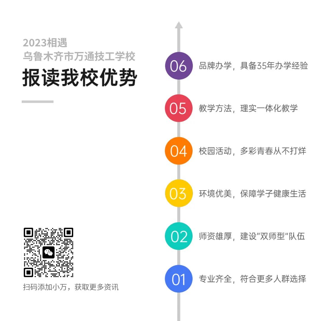 一年之计在于春,随着春天的到来,各大车企的抢人大战逐渐进入白热化阶段。近日,又一校企合作单位进校开展校园招聘工作。 新疆天宇华鑫汽车销售有限公司,位于新疆乌鲁木齐市头屯河区天恒基国际汽车城商圈,注册资金1000万元,占地6071.05㎡,是WEY汽车全国A级品牌旗舰店。 此次来校招聘的是天宇华鑫店行政人事刘经理,刘经理表示:“这是我第二次来乌鲁木齐市万通技工学校,第一次是参加了企业与学校合作的签约仪式,当时就感觉万通的学生很有精气神,今天很高兴能进校招聘,我们企业对于人才很重视的,有一套完整的人才选拔晋升制度,希望能通过此次校园招聘引入优秀的专业人才,为企业增添新鲜血液。” 参加招聘会的王同学表示:“通过和企业人事负责人的面对面沟通,我了解到了企业的用人标准和招聘的岗位偏好,也深入的了解到现阶段的市场行情,这对我的帮助很大,希望后续能与企业进行深入的交流,争取毕业后就能找到心仪的工作。” 通过各种形式的校园招聘会,乌鲁木齐市万通技工学校搭设了学生与企业之间的桥梁,为企业用人、毕业学子找工作实现了无缝对接,减少了企业用人和毕业学子的时间成本,助力毕业学子赢在起跑线! 乌鲁木齐万通技工学校 2023年夏秋季招生已开启 扫描下方二维码 或者直接点击文末左下角“阅读全文” 即可进入在线预约报名 我校坐落于美丽的亚欧中心——乌鲁木齐市头屯河区屯坪南路1009号,教学区配备科学的理实一体化教室、办公区域的主教学楼、舒适干净的宿舍、优雅的校园、舒适的学生公寓楼、多功能学生餐厅、标准化篮球场等基础设施齐全,给学生们营造了良好的学习生活环境。 关于我们 ▼ 新浪微博:@乌鲁木齐万通汽车学校 联系qq:3086068334 联系微信:18129457258 抖音:@乌鲁木齐万通技工学校 快手:@乌鲁木齐市万通技工学校 更多精彩 ▼ 扫描下方二维码关注未来 点击“阅读原文”在线报名 |