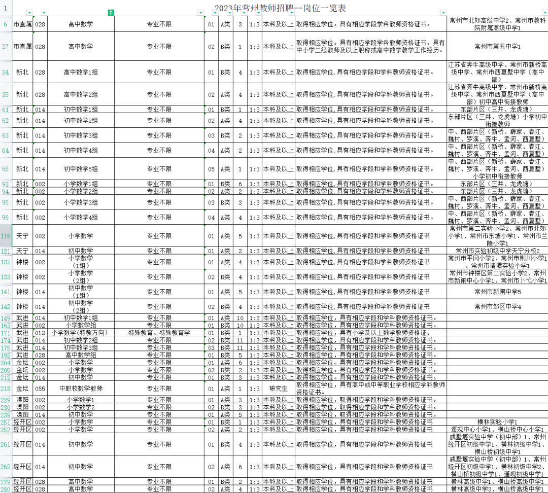 24年常州社招预计元旦前后考,备考24年的同学现在可以准备下笔试啦!今天带着大家看下数学学科23年的招聘情况。23年常州教师编制一共招151名数学教师,比语文少招107名教师;其中小学招55名,初中招71名,高中招23名,中职特殊教育各招1名。今年往届数学岗位总共有78个名额,其中不限户籍的占22个,往届本科不是常州户籍的可以从中选择一个岗位报名。下面是今年招聘数学学科的所有岗位,备考24年的同学可以参考下!