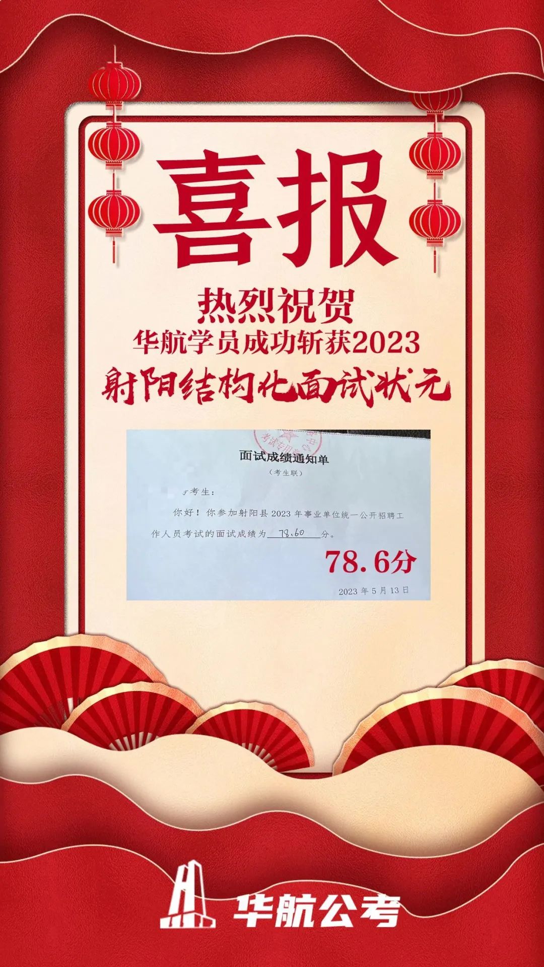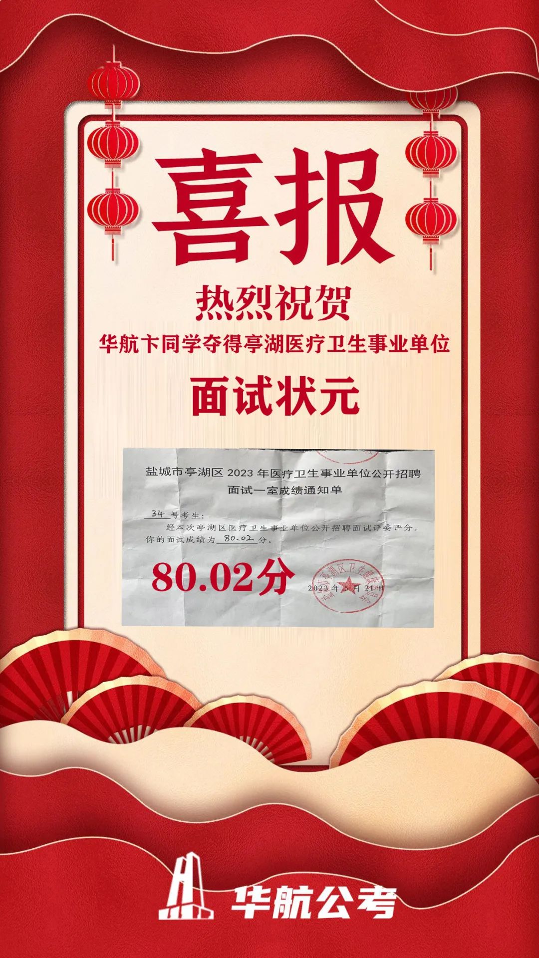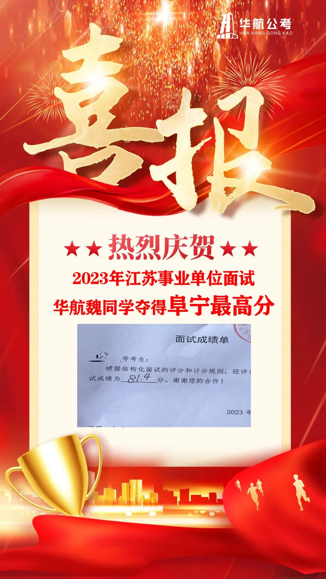 华航于同学,夺得2023年江苏事业单位面试射阳结构化面试最高分