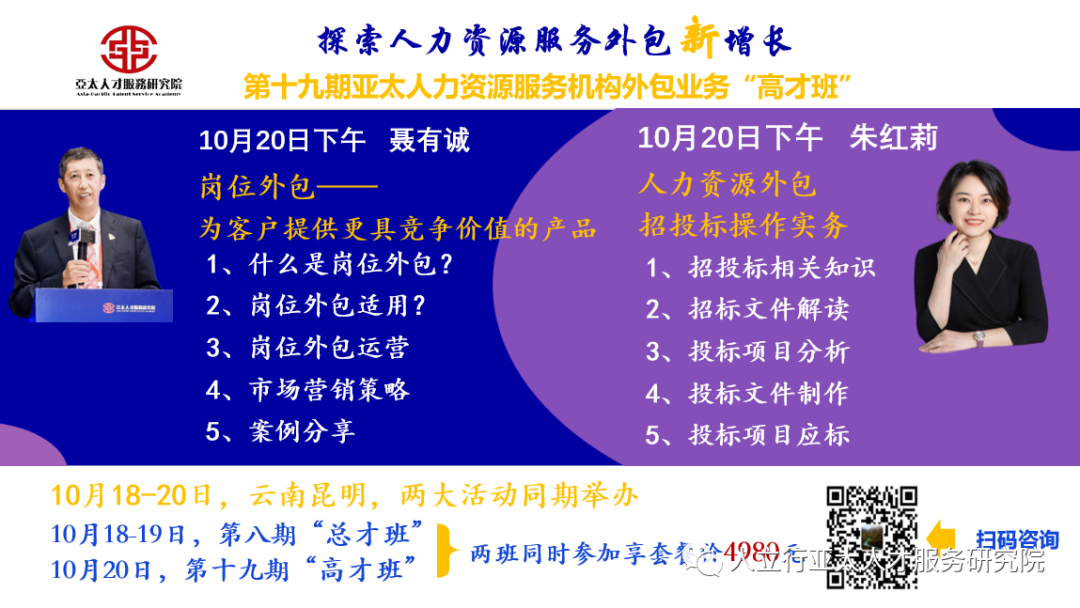 【昆明研修班正在优惠中】以“经济低速期人力资源服务公司如何保增长”为主题的第八期“总才班”和以“探索人力资源服务外包新增长”为主题的第十九期“高才班”将于10月在云南昆明举办!