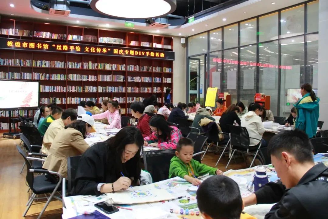 图书馆除了正常对外开放为给广大读者提供满意的借阅服务外,还策划开展了《复兴文库》专题图书展和敦煌类精品图书展,“丝路手绘 文化传承” 国庆专题DIY活动、“翰墨迎佳节 书香寄团圆”诗歌朗诵会、“书说敦煌” 暨读写分享: 《沙漠的巴丹吉林》分享会等,举办了“童心绘梦 迎国庆”少儿手工坊、“庆国庆、爱祖国 ”少儿亲子读书分享活动和每日“红色光影·致敬经典”国庆观影活动及国庆知识竞答等10项线上线下丰富多彩的阅读推广活动。据统计,双节假日期间日均进馆读者达600余人次。借阅图书和参加活动的读者队伍也由个人阅读到亲子阅读,再到家庭阅读,真正开启了全民阅读新模式。