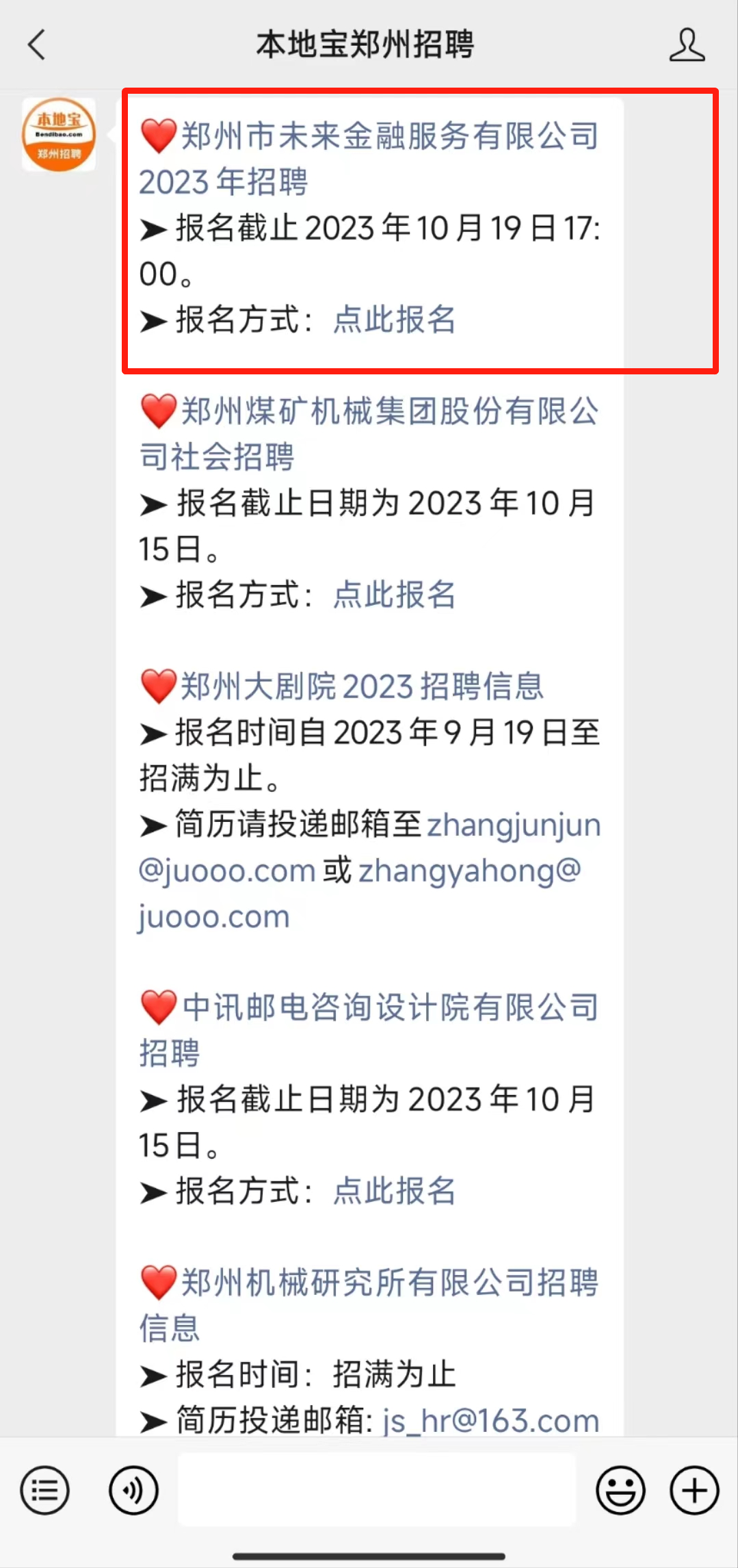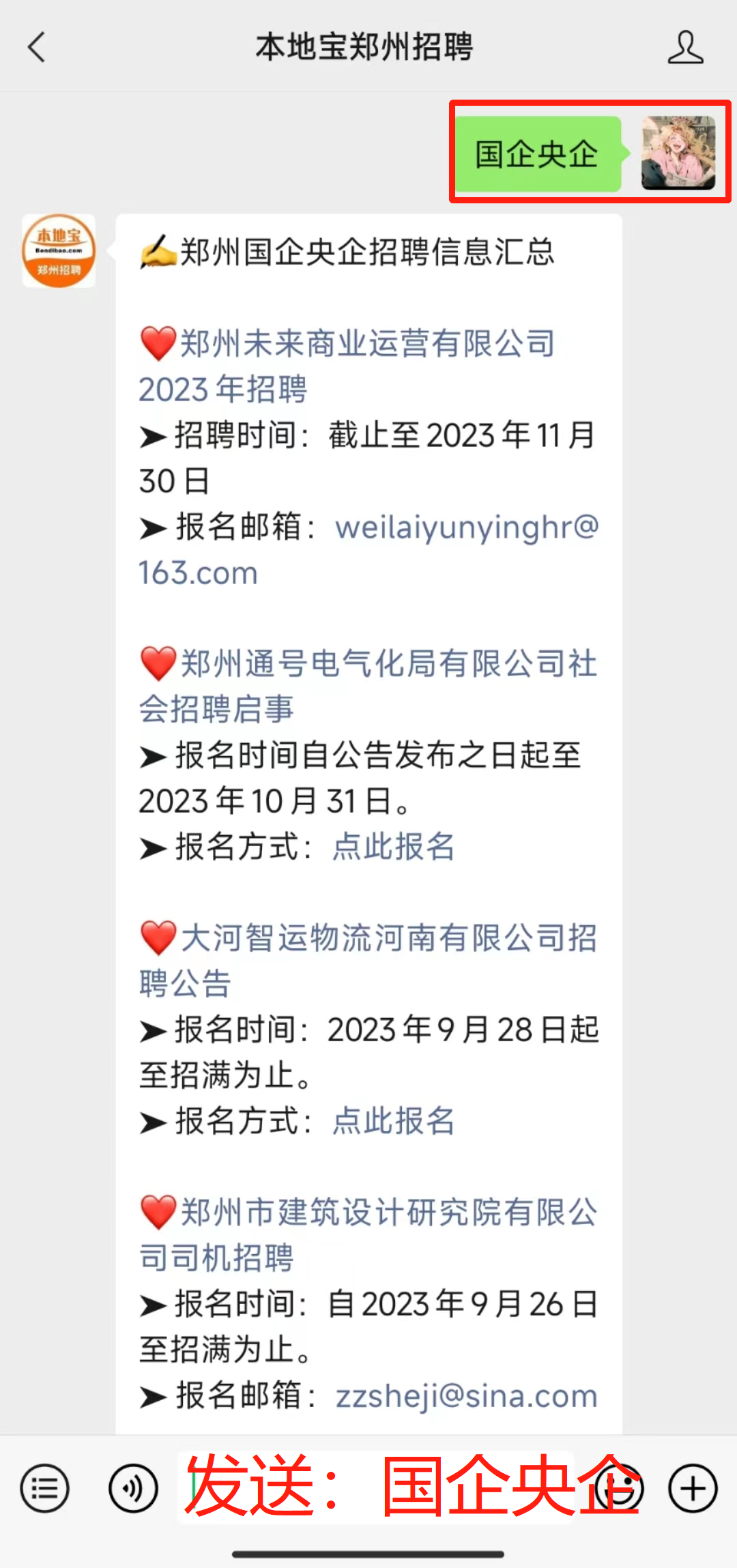 温馨提醒:点击下方名片进入【本地宝郑州招聘】并发送【国企央企】即可获取招聘公告等内容。