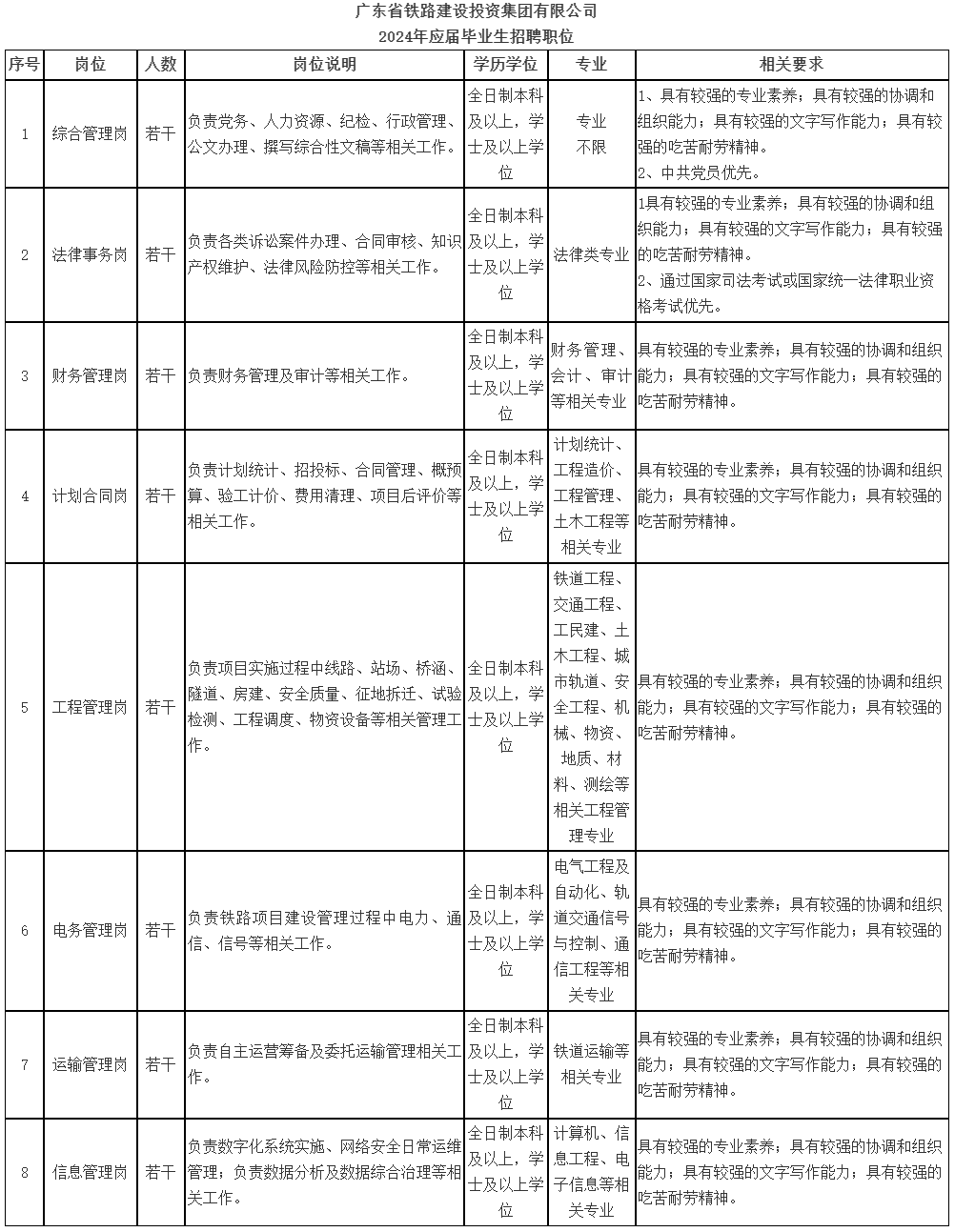 因集团发展需要,现诚聘工程类、综合类、法律类、财务类、信息类等专业人才,具体招聘岗位及要求详见附件:《广东省铁路建设投资集团有限公司2024届应届毕业生招聘职位》。