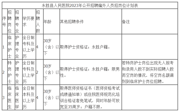 招聘岗位、名额及其他具体条件详见附件1《永胜县人民医院2023年公开招聘编外人员岗位计划表》。