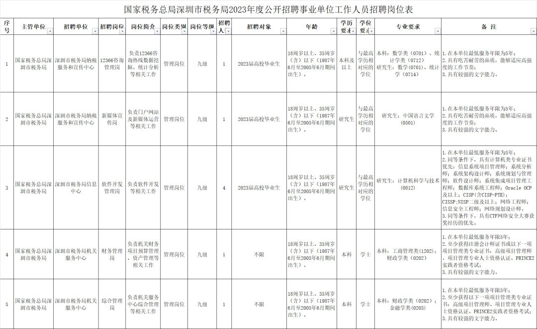 附件1:国家税务总局深圳市税务局2023年度公开招聘事业单位工作人员招聘岗位表