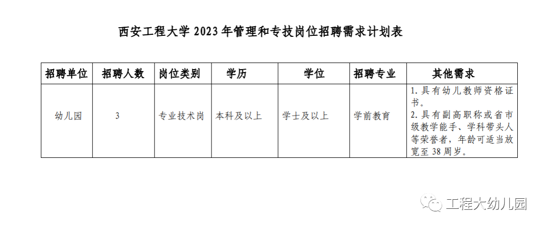 为适应我校发展需要,切实提高幼儿园保育教育质量,根据《陕西省事业单位公开招聘工作人员实施办法》、《西安工程大学2023年管理和专技岗位招聘需求计划》及《西安工程大学2023年管理和专技岗位招聘公告》,经学校研究决定,面向社会公开招聘幼儿园教师,具体招聘事宜如下: