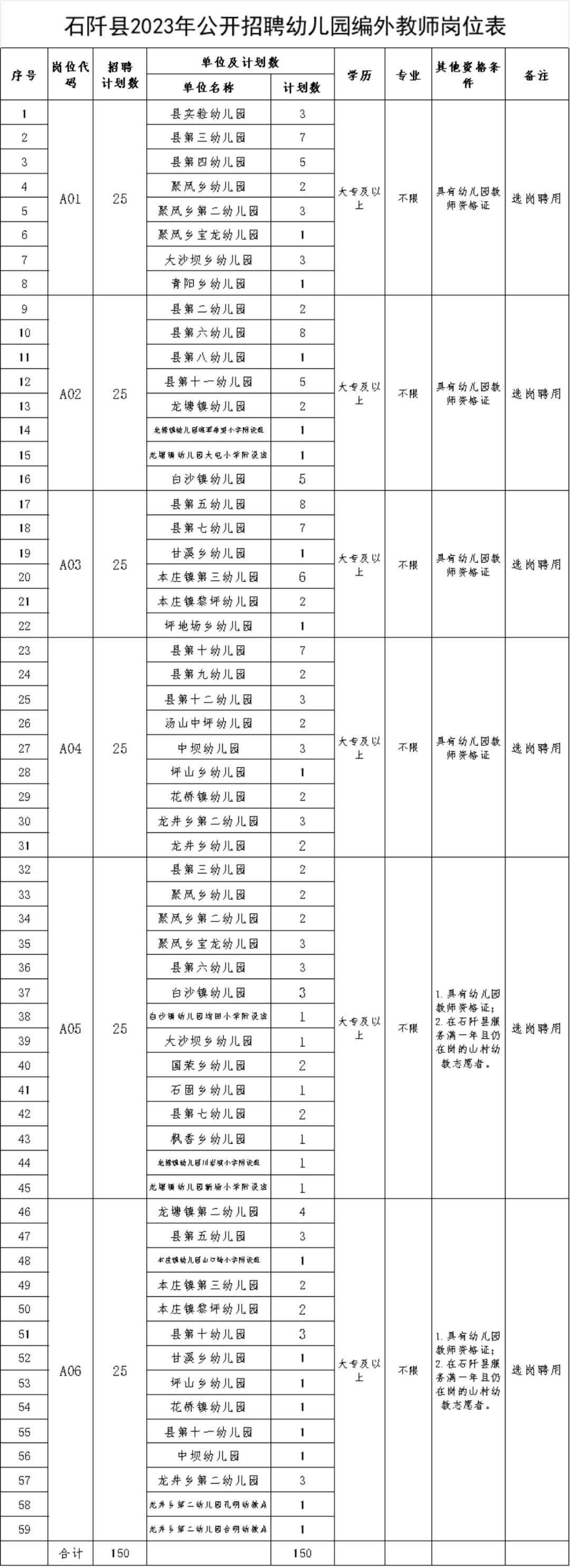 此次招聘幼儿园编外教师150名,其中,100名面向社会招聘,50名面向在石阡县服务满一年及以上且仍在岗的山村幼教志愿者招聘。具体招聘情况详见《石阡县2023年公开招聘幼儿园编外教师岗位表》(附件1)。