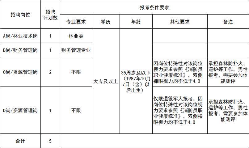 因工作需要,南陵县丫山林场面向社会公开招聘5名工作人员,本次招聘工作委托安徽皖信人力资源管理有限公司组织实施。现将有关事项公告如下:坚持公开、平等、竞争、择优的原则和德才兼备的用人标准。本次招聘工作按照发布招聘公告、报名和资格审查、体能测评、考试、体检与考察、确定拟聘用对象并公示、办理聘用手续等步骤进行,安徽皖信人力资源管理有限公司(以下简称皖信公司)负责具体组织实施。本次招聘事宜及考试、体检、考察、公示、聘用等后续信息,通过中国南陵网和安徽皖信“标准化招聘考试网”(http://wxpta.ahwxhr.com/)等相关媒体发布,请考生及时登录查阅。本次面向全社会公开招聘工作人员5名,具体岗位详见《2023年南陵县丫山林场公开招聘工作人员岗位计划表》。招聘对象为国家承认的大专及以上学历,且符合以下条件:2.拥护党的领导,遵守宪法和法律,品行端正,具有良好的职业道德,具备较强的团队精神和奉献精神无违法违纪行为;3.有正常履行岗位所需的专业条件和适应岗位要求的身体条件;4.年龄:35周岁及以下(1987年10月7日(含)以后出生);4.经政府人力资源社会保障部门认定具有考试违纪行为且在停考期内的人员;5.曾因犯罪受过刑事处罚的人员、曾受到限制人身自由行政处罚的人员和曾被开除公职的人员、受到党纪政纪处分期限未满或者正在接受纪律审查的人员、处于刑事处罚期间或者正在接受司法调查尚未做出结论的人员;1.报名时间:2023年10月7日—2023年10月9日(上午8:30—12:00;下午13:30—17:00)。2.报名地点:南陵县就业创业一站式服务中心3-5号窗口。3.报名办法:报考人员报名时须提供本人有效居民身份证、户口本、退伍证、学历(学位)证书原件和复印件及近期一寸免冠照片3张,并如实填写《2023年南陵县丫山林场公开招聘工作人员报名登记审查表》(扫码填写)。4.报考人员报名时须真实、准确、有效地提供报考信息,凡弄虚作假的,一经查实,即取消考试、聘用等资格。5.符合条件的报名人数与招聘岗位计划数的比例应不低于3:1,不足规定开考比例的,取消或相应核减该岗位招聘计划数。体能测评参照《消防救援人员体能测试项目评分标准》,满分100分,体能测评低于60分的将不得参加招聘后续环节;A岗/林业技术岗、B岗/财务管理岗不需要参加体能测评考试。