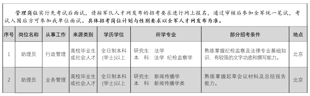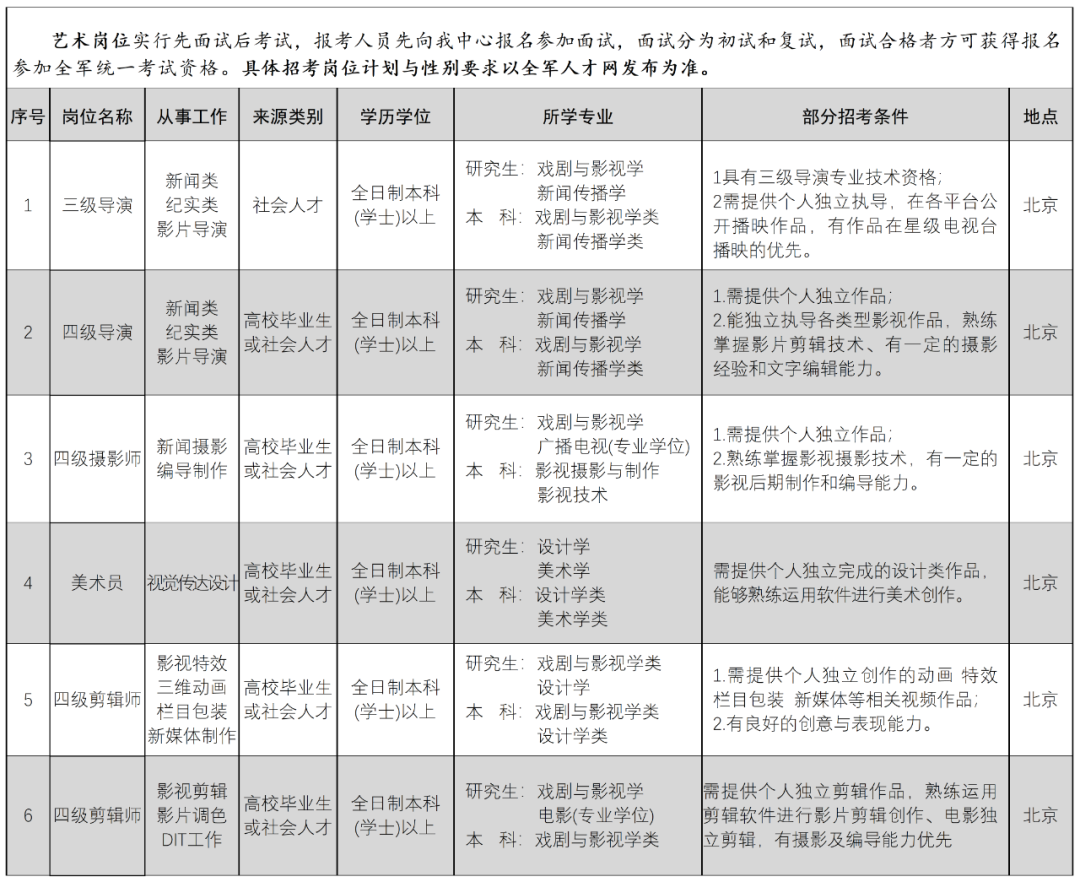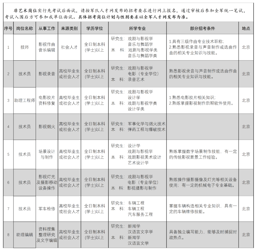 按照全军统一招考部署安排,报考八一电影制片厂文职人员艺术岗位,实行先面试后笔试。广大报考人员请先向我单位报名参加面试,有关具体的报名流程及材料要求请您登录中国人民解放军军队人才网(http://www.81rc.mil.cn)或扫描下方二维码关注解放军文化艺术中心公众号。