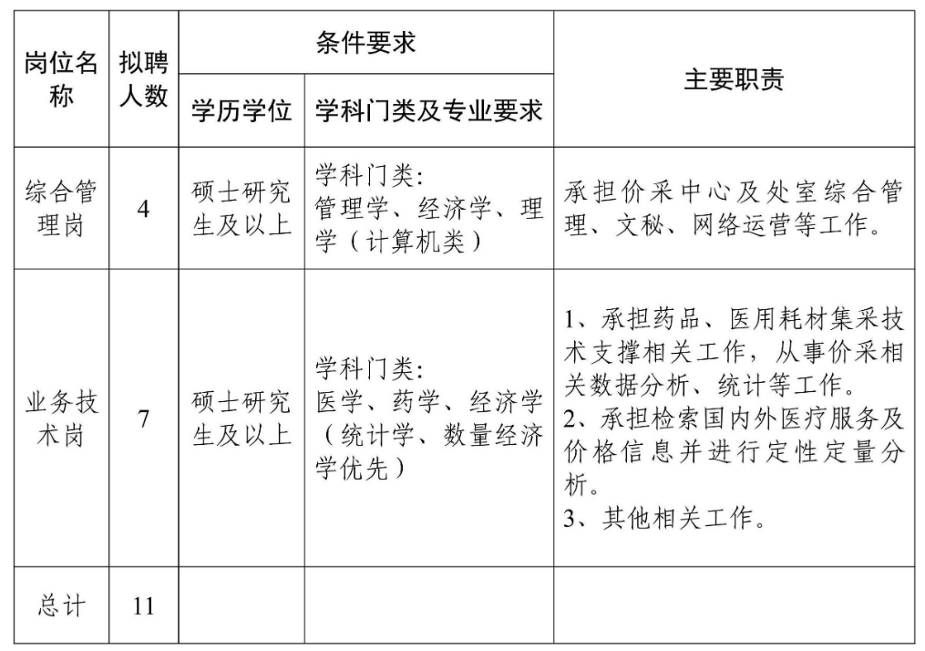 国家医疗保障局医药价格和招标采购指导中心(以下简称“价采中心”)是国家医疗保障局直属事业单位,主要承担制订医药价格技术标准规范、监测医药价格信息、协助指导省级医药招标采购平台建设和运行等工作。根据工作需要,现面向社会公开招聘合同制人员,有关事项公告如下: