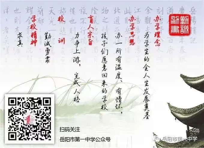 倚千古名楼,瞰洞庭万顷碧波;承百年文化,育万千社会精英。岳阳市一中创办于1903年,是湖南省首批挂牌的重点中学、首批命名的省示范高中、全国首批开办内地西藏班的中学。是清华大学、北京大学“优质生源基地”,荣获“全国五一劳动奖状”“全国教育系统先进集体”“全国民族团结进步模范单位”“全国德育先进学校”“全国现代教育技术实验学校”“全国中小学生态道德建设示范学校”“全国五四红旗团委”等200多项国家级、省级荣誉。近年来,学校高考成绩骄人,学校教育教学质量一直在全市遥遥领先,也始终处于全省示范高中的最前列。