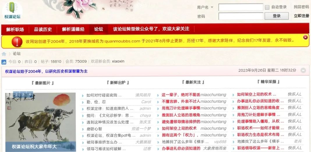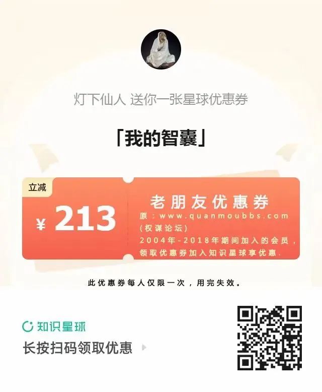 (www.quanmoubbs.com)自我2004年创建网站时就跟着我,里面有我的良师益友,当时没有太多自媒体参考,除了天涯论坛,就是权谋论坛,期间写作我遇到很多瓶颈,是你们给我邮寄了很多书籍,和古籍对您们的支持与鼓励我深深的表示感谢。自2021年以后论坛我就很少登录了,如今知识星球价格调整至588元,昨天公众号后台有权谋论坛老会员留言说我喜新厌旧,能否放低门槛给他们一次加入的机会。我觉得做任何事物都是一时的,有一个朋友陪伴是长久的,我这里通过跟星球客服沟通,设置几个特殊名额,凡是2004-2018年期间注册权谋论坛的会员都可以领取下方优惠券加入“知识星球”阅读我在星球发布的作品。