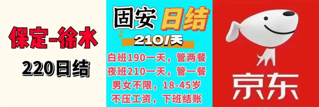4、京津冀京东:230/天,18-55周岁,男女不限,免费住宿,就近分配。