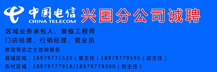 兴国新辰通讯本公司因业务发展需要招聘:移动客服:10名综合工资:3500~6000元/月底薪+提成+奖励,单休岗位要求:女18岁以上会基本电脑操作,普通话标准!反应敏捷,有团队精神!工作7个小时制上班时间:早上8:30~12: 00 下午2:00~5:30,奖金上不封顶,诚邀有激情有梦想的你加入!工作地点:潋江大道医药总公司旁注:有意者尽量直接电话联系,本人没有时间看简历