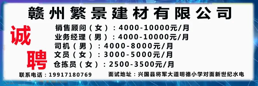 销售精英:多名薪资待遇:7000-10000元/月 包吃住上班时间:8:30-12:00 14:00-18:00 单休岗位职责:1.负责呼出公司已有赣州楼盘客户信息,通过清晰的表达方式,邀约客户进店(电销)。2.负责对所有意向客户的资料整理,定期回访邀约。3.负责通过电话对市场进行开拓。4.积极学习,实时掌握公司的活动内容,对公司的产品服务做到了然于心。 5.积极参与市场部外拓活动,包括各大商场超市等人流量大的地方进行意向客户信息收集。6.服从管理安排,配合团队工作,以公司利益为核心。任职资格:1、性别不限,年龄不限,学历不限;2.为人性格开朗,热情大方;有销售经验或市场营销专业优先; 3.勤奋,学习力强,配合度高; 4.有团队意识,有企图心、爱心。