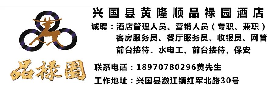 总台接待、收银员:9名餐厅接持、收银员:3名薪资:2500-5000元/月要求:1、20-35岁:男女不限、形象气质佳,身高:1.6M以上2、中专以上学历:懂电脑操作、有良好的服务意识、沟通能力强福利待遇:1、 薪酬:底薪+提成+工龄工资+其他奖金2、 保险:社会保险+医疗保险+工伤保险3、 膳食:免费提供一日三餐(早餐+中餐+晚餐)4、 宿舍:设备齐全,热水、空调、电视、娱乐设施5、 假期:每月公休+国家法定假欢迎来电垂询地 址:兴国县潋江镇红军北路30号
