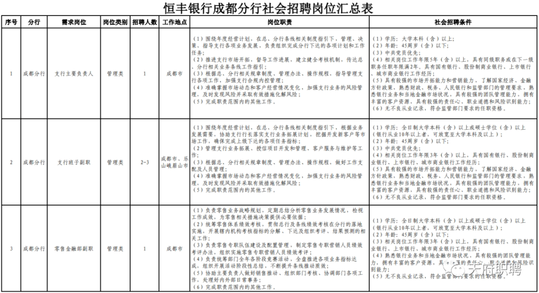 恒丰银行成都分行于2007年4月26日成立后,以不断满足客户需求为己任,积极投身地方经济建设,经营规模和效益持续快速增长,各项业务快速发展。目前已设立4家二级分行、12家同城支行、1家小微支行。恒丰银行成都分行现根据业务发展需要,诚邀金融精英加盟,共创美好未来!