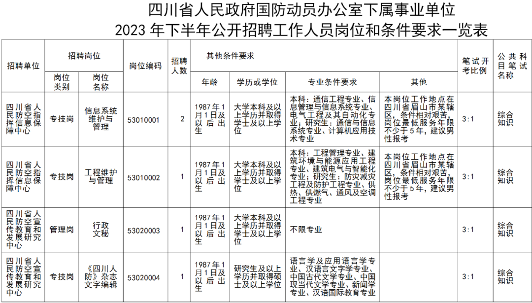 面向全国招聘2023年8月31日前取得国民教育本科及以上学历和学士及以上学位,并完全符合《四川省人民政府国防动员办公室下属事业单位2023年下半年公开招聘工作人员岗位和条件要求一览表》(含表注,以下简称《岗位和条件要求一览表》)相关岗位条件要求和本公告其他要求的人员。