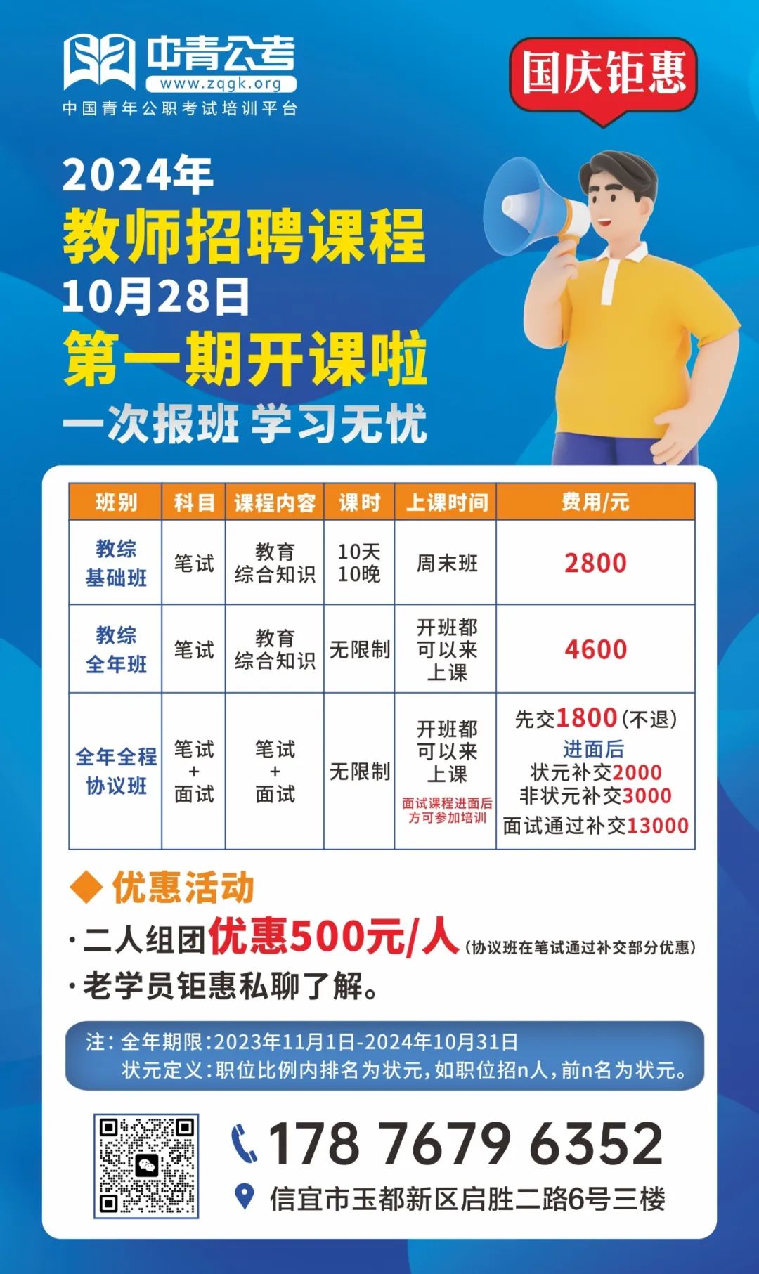 相信不少考生都有这样一个发现:凡是进面的同学基本都是至少提前大半年甚至一年以上开始持续学习的。为方便广大考生提前备考,中青公考为广大考生在考编中保驾护航,特开设教师招聘笔试周末培训班,从2023年10月28日开始笔试实战技巧班滚动开课!