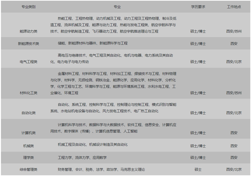 西安热工研究院有限公司(以下简称“西安热工院”)是我国国家级能源电力技术研发机构。入选国务院国资委首批“科改示范行动”企业和创建世界一流专业领军示范企业。拥有清洁低碳热力发电系统集成及运维国家工程研究中心、国家能源清洁高效火力发电技术研发中心、煤基清洁能源国家重点实验室、陕西省燃煤电站锅炉环保工程技术研究中心等研发平台。聚焦燃煤电站烟气污染物治理、燃煤耦合掺烧污泥和生物制燃料、一体化节能、高灵活性发电、自主可控工控系统、电力网络安全、智能发电、电站化学和水处理技术、高温金属材料、新能源、核电、储能、燃气轮机、超临界CO2循环发电、电气等领域,积极开展科技研发、技术服务和成果转化应用,致力于打造“绿色低碳、智慧高效、自主可控、行业领先”的国家级能源电力原创技术策源地!(1)国内外应届毕业博士研究生、硕士研究生,毕业院校以国际QS大学排名前200的知名院校或国内985、211重点院校为主,完成规定学业并获得相应学历、学位证明,成绩优秀;(2)硕士研究生年龄原则上不超过27周岁,博士毕业生年龄原则上不超过32周岁;(3)综合素质好,具备较强的责任意识和良好的团队协作精神,有较强的学习能力、分析能力、创新意识和沟通能力,勤奋、踏实、吃苦耐劳;(4)身心健康,具有良好的道德品质和心理素质,认同华能集团与西安热工院企业文化;
